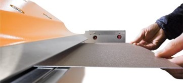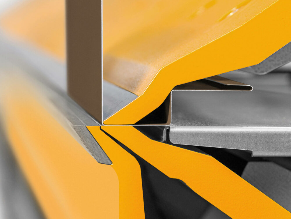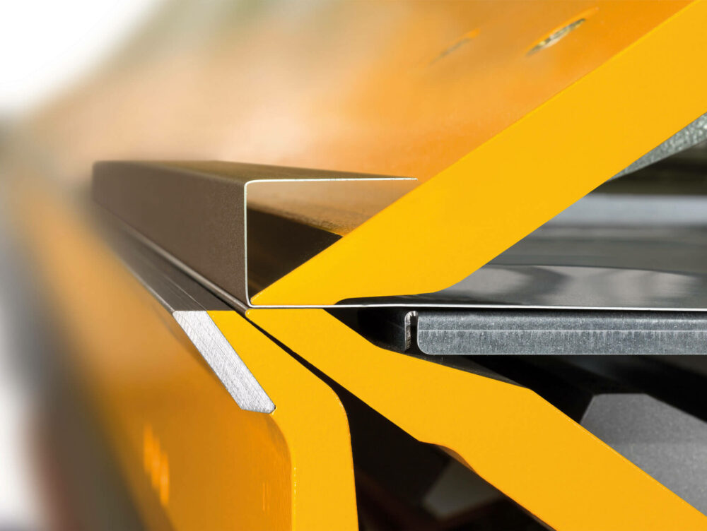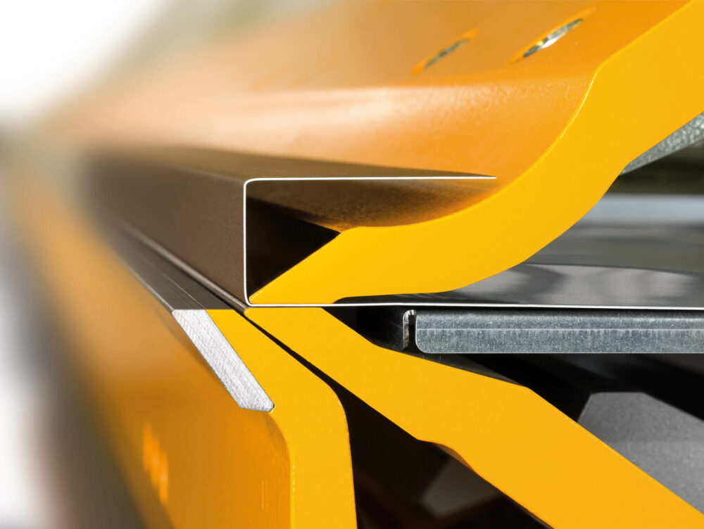 Als neueste Werkzeugform ist ein Oberwangenwerkzeug mit Nase erhältlich. Typische Spenglerbleche wie Wandanschluss- und Ortgangbleche können damit noch einfacher und noch flexibler hergestellt werden – wie dargestellt z.B. 50 mm nach innen und 25 mm nach oben.